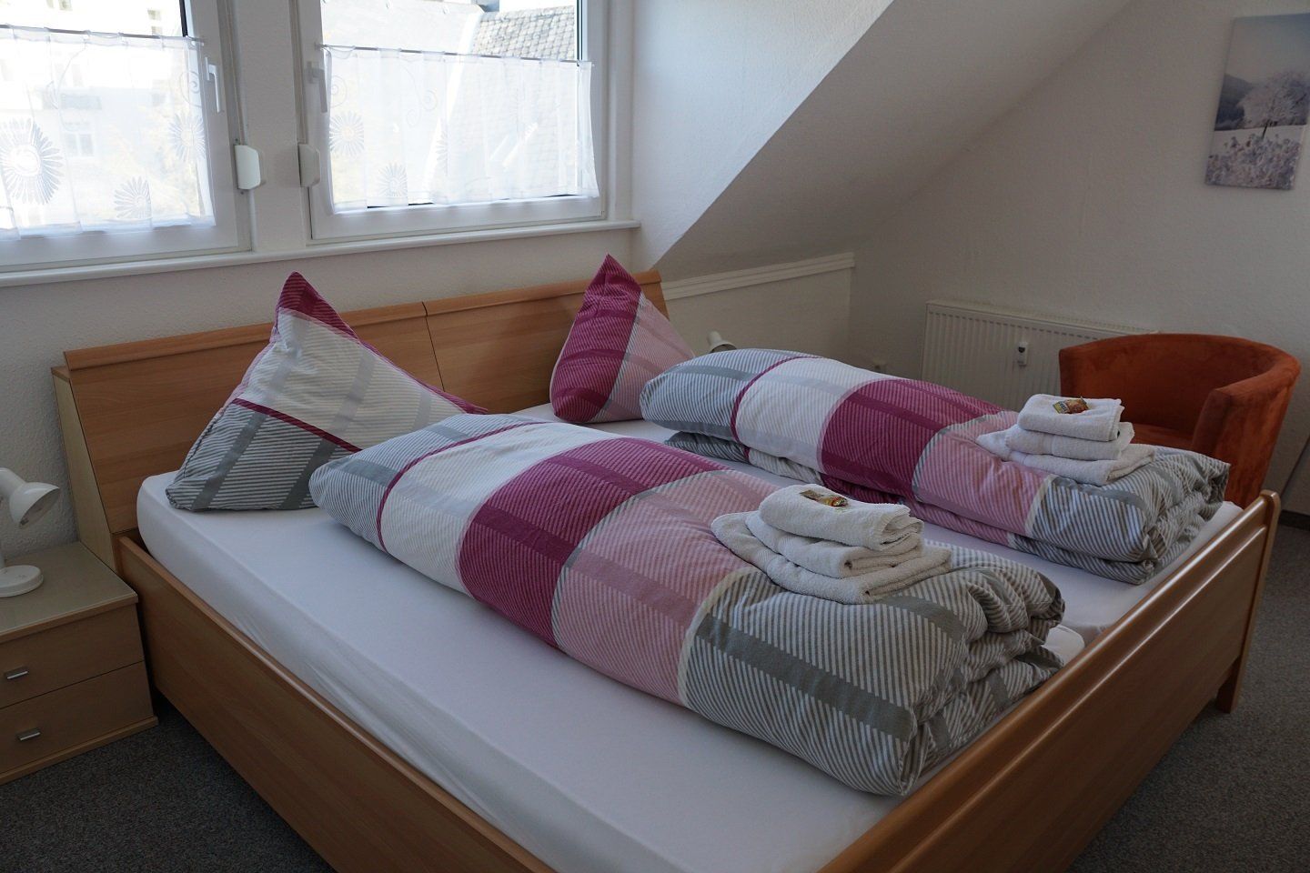 Die Nichtraucher-Wohnung ist für 4 Personen ausgelegt. Sie verfügt über zwei getrennte Schlafzimmer. Ein Schlafzimmer ist mit einem Doppelbett eingerichtet, in dem zweiten Schlafzimmer sind zwei Einzelbetten, die mit einem elektrischen Lattenrost ausgestattet sind. Ein Kindergitterbett und ein Kinderhochstuhl befinden sich in der Wohnung.