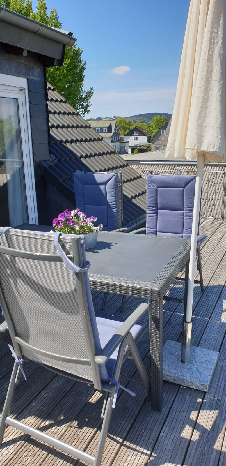 Die Wohnung befindet sich im 2. Obergeschoss. Die Dachterrasse ist mit modernen Gartenmöbeln ausgestattet.