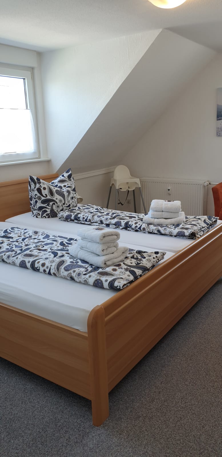 Die Nichtraucher-Wohnung ist für 4 Personen ausgelegt. Sie verfügt über zwei getrennte Schlafzimmer. Ein Schlafzimmer ist mit einem Doppelbett eingerichtet, in dem zweiten Schlafzimmer sind zwei Einzelbetten, die mit einem elektrischen Lattenrost ausgestattet sind. Ein Kindergitterbett und ein Kinderhochstuhl befinden sich in der Wohnung.