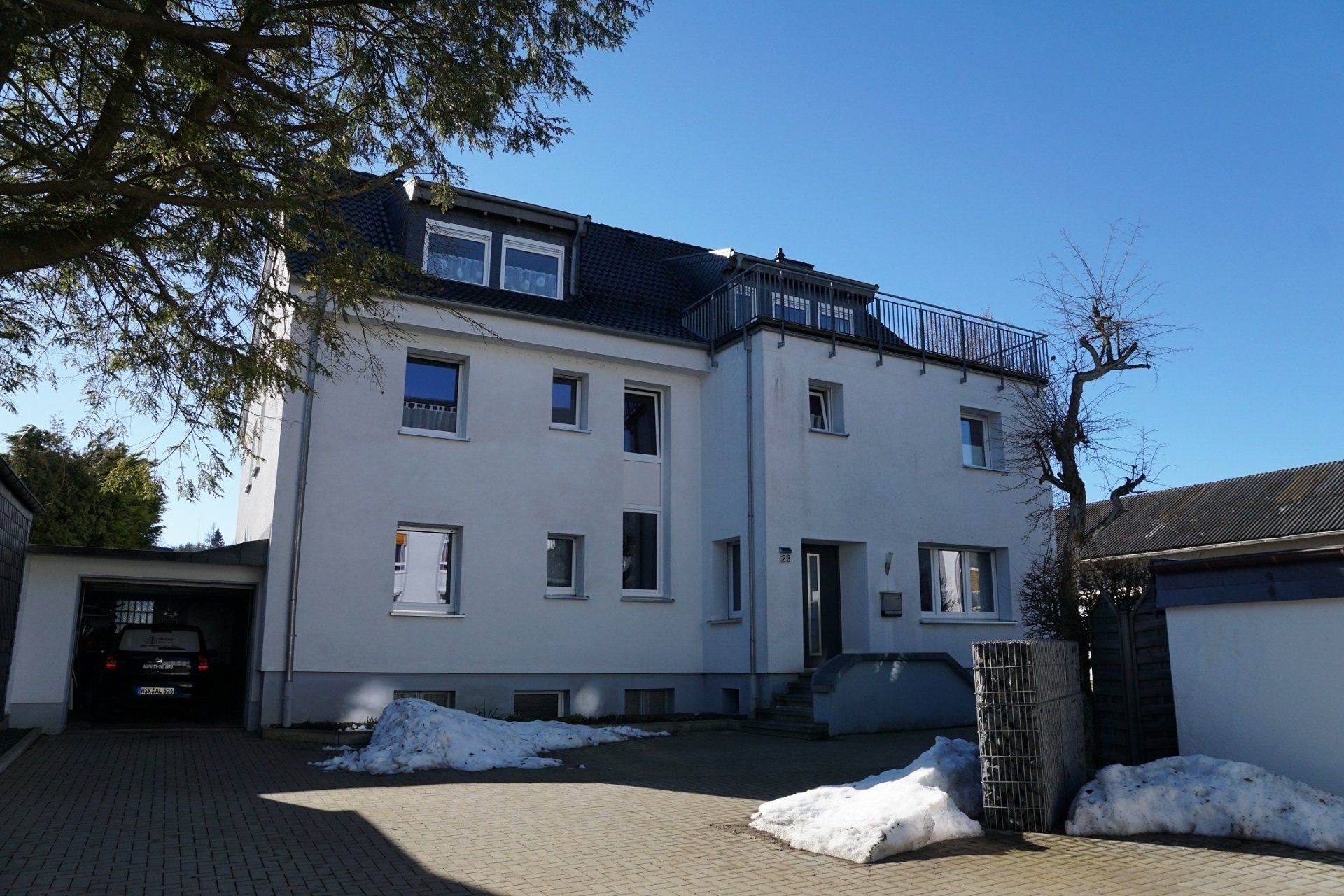 Die Wohnung befindet sich im 2. Obergeschoss. Die Dachterrasse ist mit modernen Gartenmöbeln ausgestattet.
